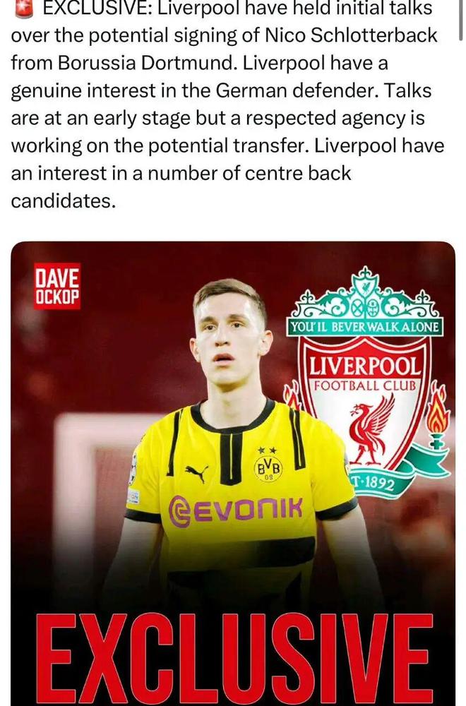 Dave独家:利物浦已经与施洛特贝克进行了初步谈判,利物浦对他很感兴趣,谈判仍在初期,但知名经纪商已经在推动转会,利物浦对很多中后卫都感兴趣。